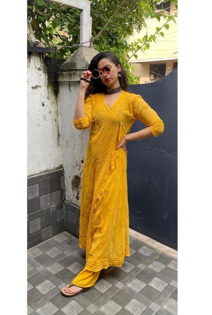 This Pretty Angrakha Kurti is traditional combination of classy clothing style set by Nawabs of Lucknow, It Is made with Bakhiya Chikankari Embroidery on soft Georgette fabric