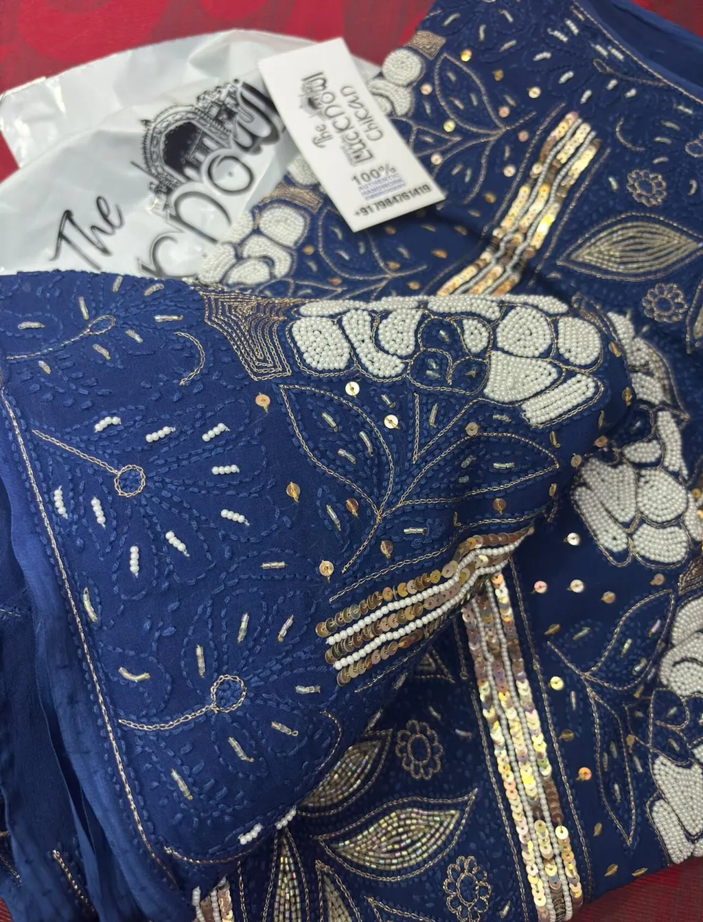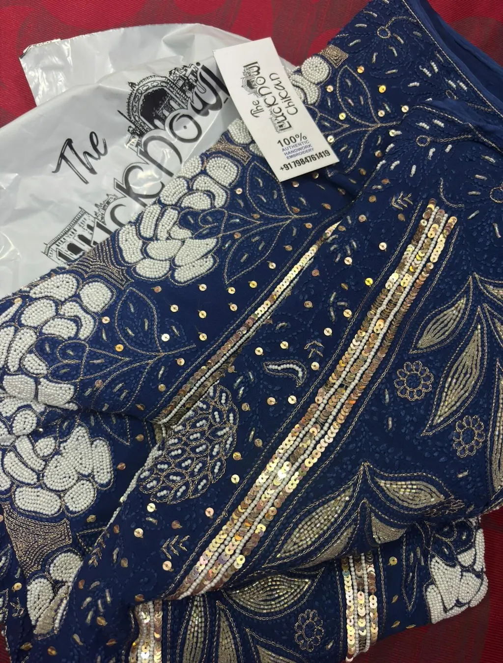 This saree features authentic hand-stitched chikankari embroidery complemented by beautiful sequence, cutdana, kasab and pearl embellishments. The intricate design process required a total of 6 months to finalize. An accompanying blouse is included with this saree