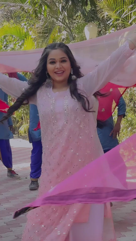 Kurta Set is embroidered on semi georgette sheer light fabric, dyed in pretty shades, embellished with mirror work. Its beautified with pure handwork chikankari. Further dyed in pretty shade.